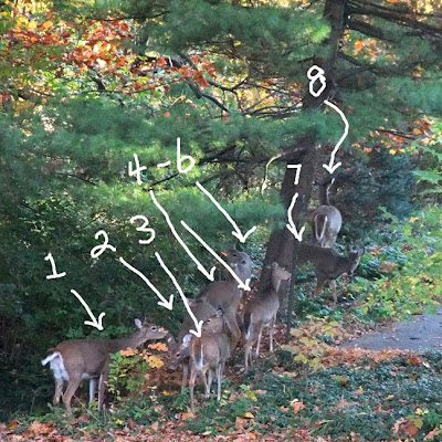 This is not a deer farm, but rather my urban backyard. On any given day of the week we can peer out the windows and see our friends frolicking…eating from bird feeders, munching on shrubbery and flowers without a care in the world. Deer like it here and feel very, very comfortable. They don’t seem to care that this is not suburbia or a place where there should be large quantities of wildlife (sorry Dad.) And me? I’m officially sick after being in denial throughout the weekend. I’m afraid it’s payback time. My body is not happy about my refusal to pass on parties and other Halloween festivities when I knew better. Really I did. So here I am, showing you pictures of female deer rather than an interesting project. Now, I need to doze…not eight. (sorry…toomuchsinusmedicine confusing bad deer joke.) Off to rest.