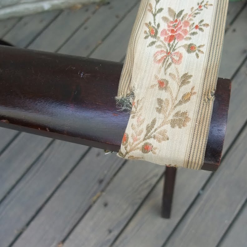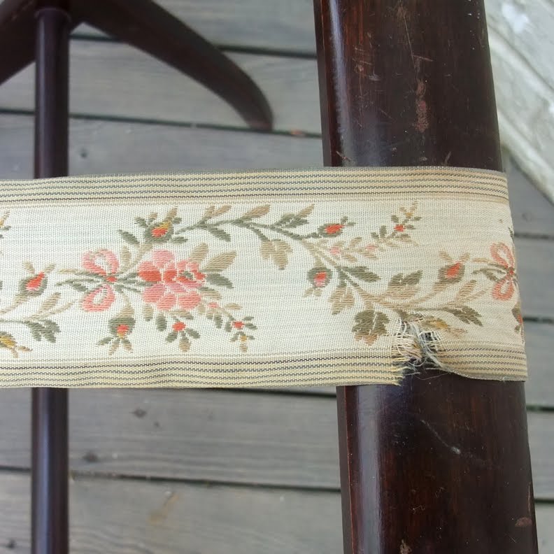 I happened to have this ribbon in my stash (also purchased at a rummage sale in a box like that one.) It was exactly the right width and had the same charm of the original luggage rack ribbon. I knew it was meant to be.
