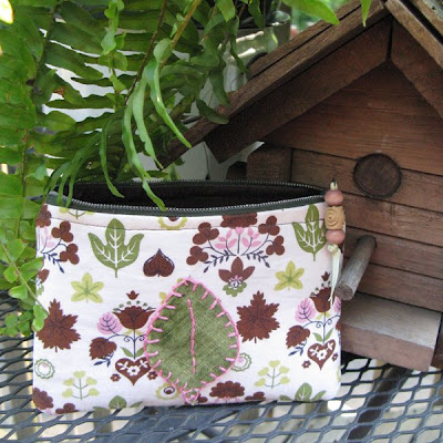 Before the pouch was all stitched together, I blanket stitched and back stitched (do I sound like I know what I’m talking about?) the leaf applique on the front. A little ribbon and some beads for a zipper pull and there you have my new…I’m thinking cosmetic…bag. Now I want to make about 20 more. “Hi my name is June…and I can sew a zipper.”