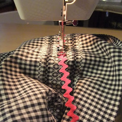 As promised, I added a hefty piece of hot pink rickrack to the bottom of the pillowcase. I straight-stitched right down the center of the rickrack all the way around starting and ending at a side seam. The smocking you see was already part of this pillowcase…an extra bonus.