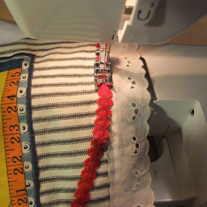 After the applique pieces are stitched, pin ruffle trim to the bottom and top edges of the dish towel. Next, sew the trim to the front edges of the dishtowel.