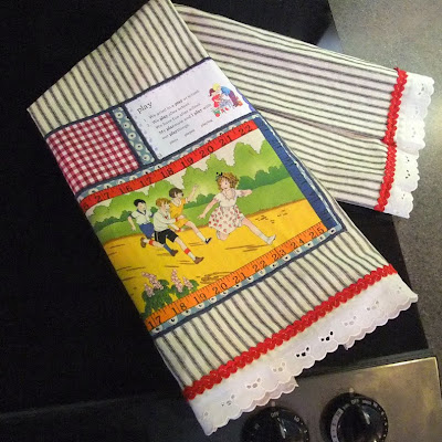 I’m a huge fan of this store’s artsy dishtowels. I figured it was about time I made a few myself. After all, when you break it down it’s just a fabric rectangle with trim and applique, right? The Totally Tutorials supplies/tutorial exchange with Ruby Jane’s Retro fabric was another spark that led to this project idea. If you were here yesterday, you read about that and my final piece of inspiration…a newly acquired, 1944 children’s dictionary.
