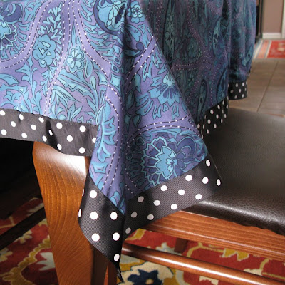 Here’s my purple, paisley, polka-dotted table cover all finished taking a test run on our dining table. I’ll also have a white cloth under it at the show which will extend to the floor so I can hide stuff like bins and bags and maybe myself depending on how things go… : 0