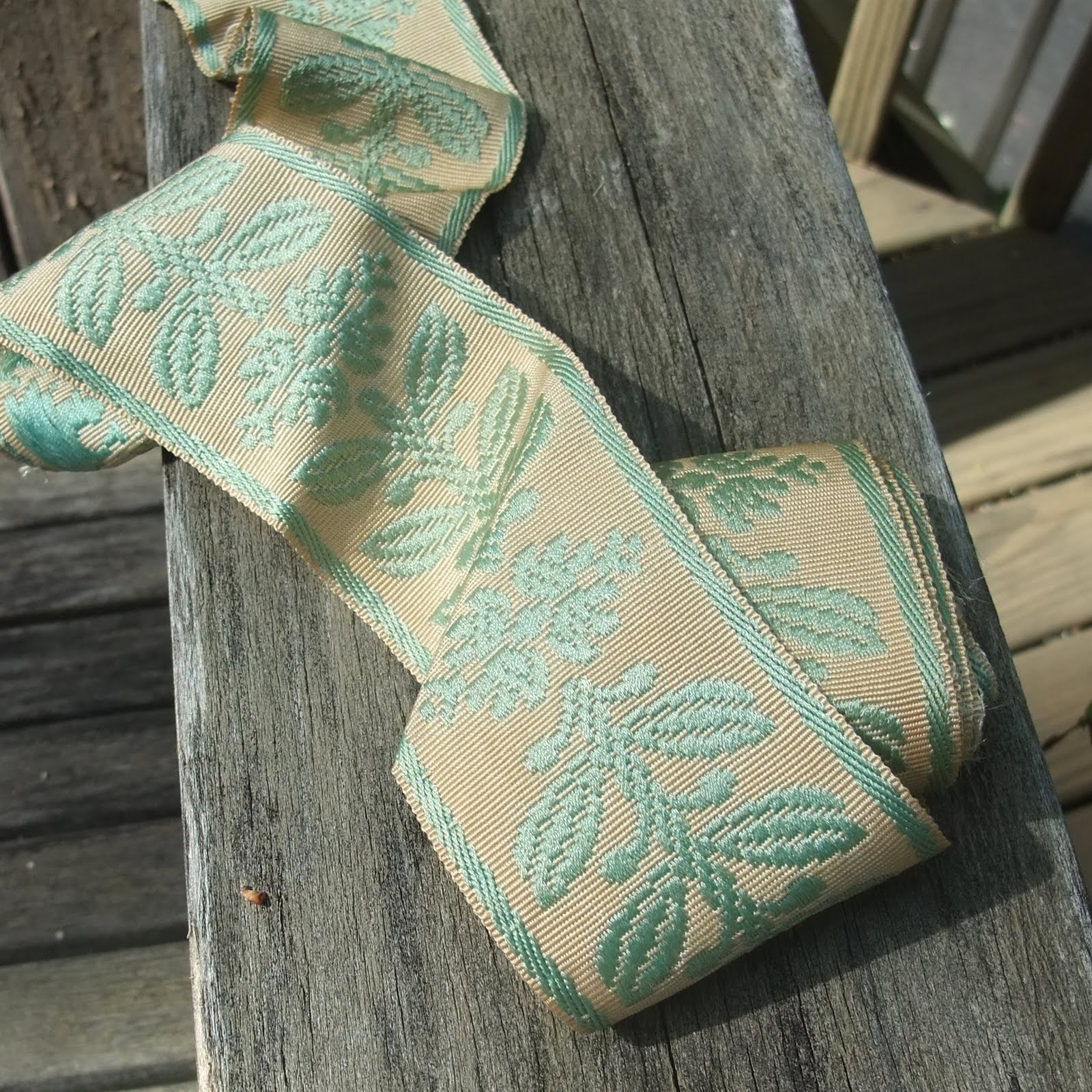 I happened to have this ribbon in my stash (also purchased at a rummage sale in a box like that one.) It was exactly the right width and had the same charm of the original luggage rack ribbon. I knew it was meant to be.