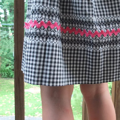 I then threaded hot pink ribbon through the top casing in the front and the back of the dress. I pulled to cinch and then sewed the ribbon at each open end so that the ribbon wouldn’t come out (you know…like the annoying hoodie cords I find in my washing machine or catch my children holding…like those will ever go back in their casing.)
