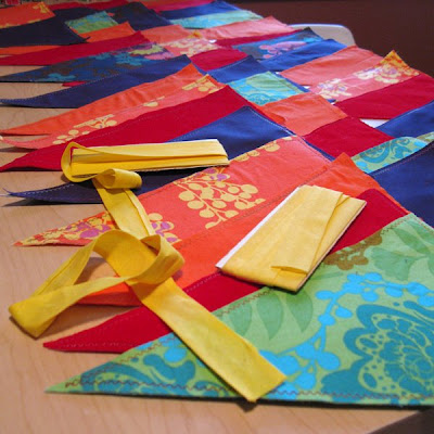 I decided it was about time I signed on to be a vendor at an art fair. It’s one of those things that I knew I wanted to try on for size sooner or later to see if we were a fit for each other. So when opportunity knocked, I answered and signed on for what I felt was a good fit for novice me (good fit for my first show = one day, inside, laid back yet professional, whimsical vendors with a humorous, friendly organizer.) Now with a little over a month to go, I’m working on my booth design. If you’ve ever peeked over at my etsy wares you know I’m all about bright colors and fun. The goal is for my booth to match, yet not overpower the goods. My vision includes a pennant garland to add to the festive atmosphere I’m working to create. I didn’t use a specific tutorial or anything to make…this wasn’t wheel invention. I just created a triangle shape from cardboard for a pattern, then cut, interfaced and pinned together more triangles than I ever cared to count.